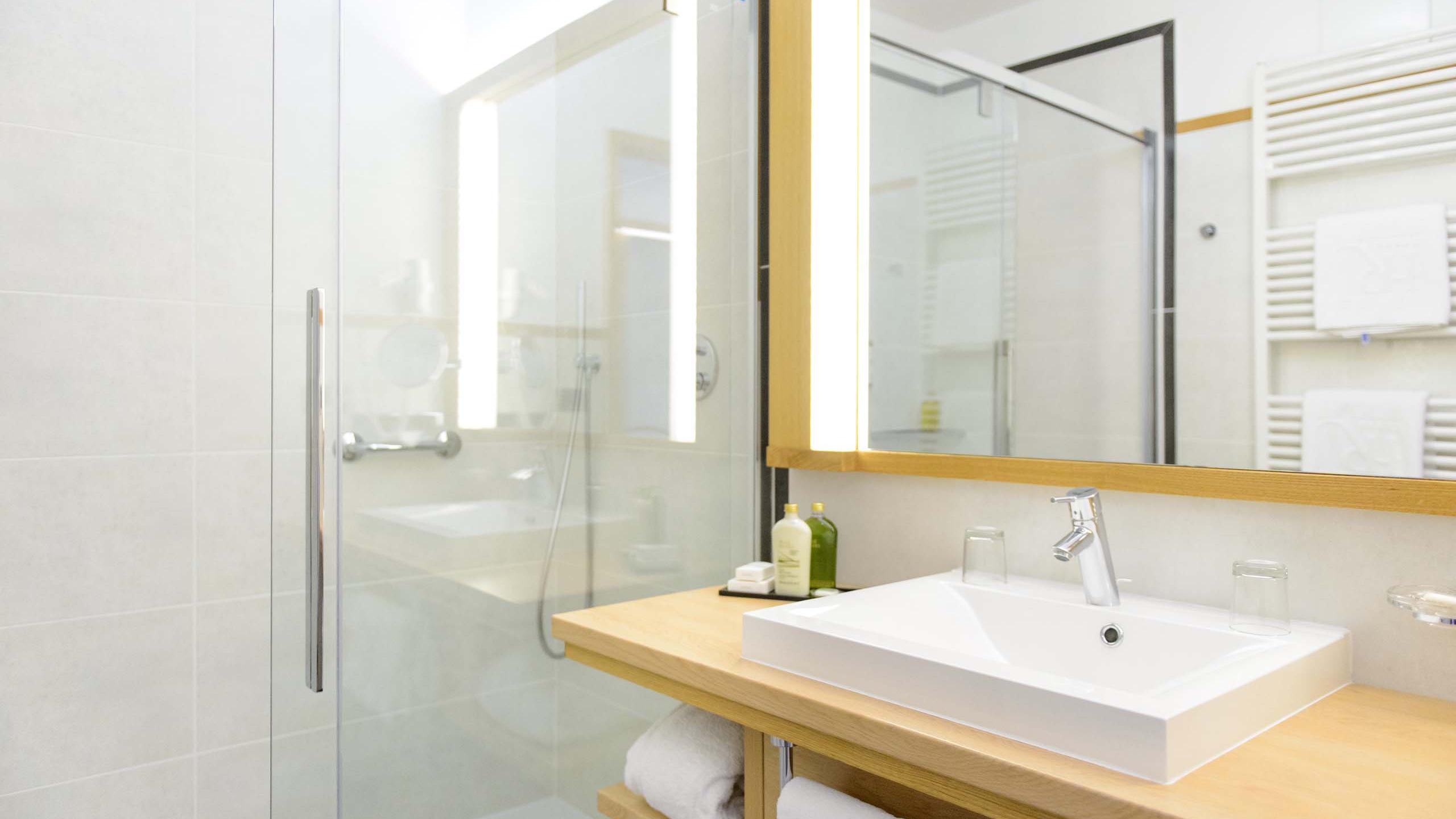 Our airy Zielspitz double rooms, furnished in a modern style, are especially warm and welcoming. The wooden flooring and furniture made of chestnut wood create a warm glow. A special highlight is the panoramic view of the surrounding Meran countryside and mountains from the southwest-facing balcony.