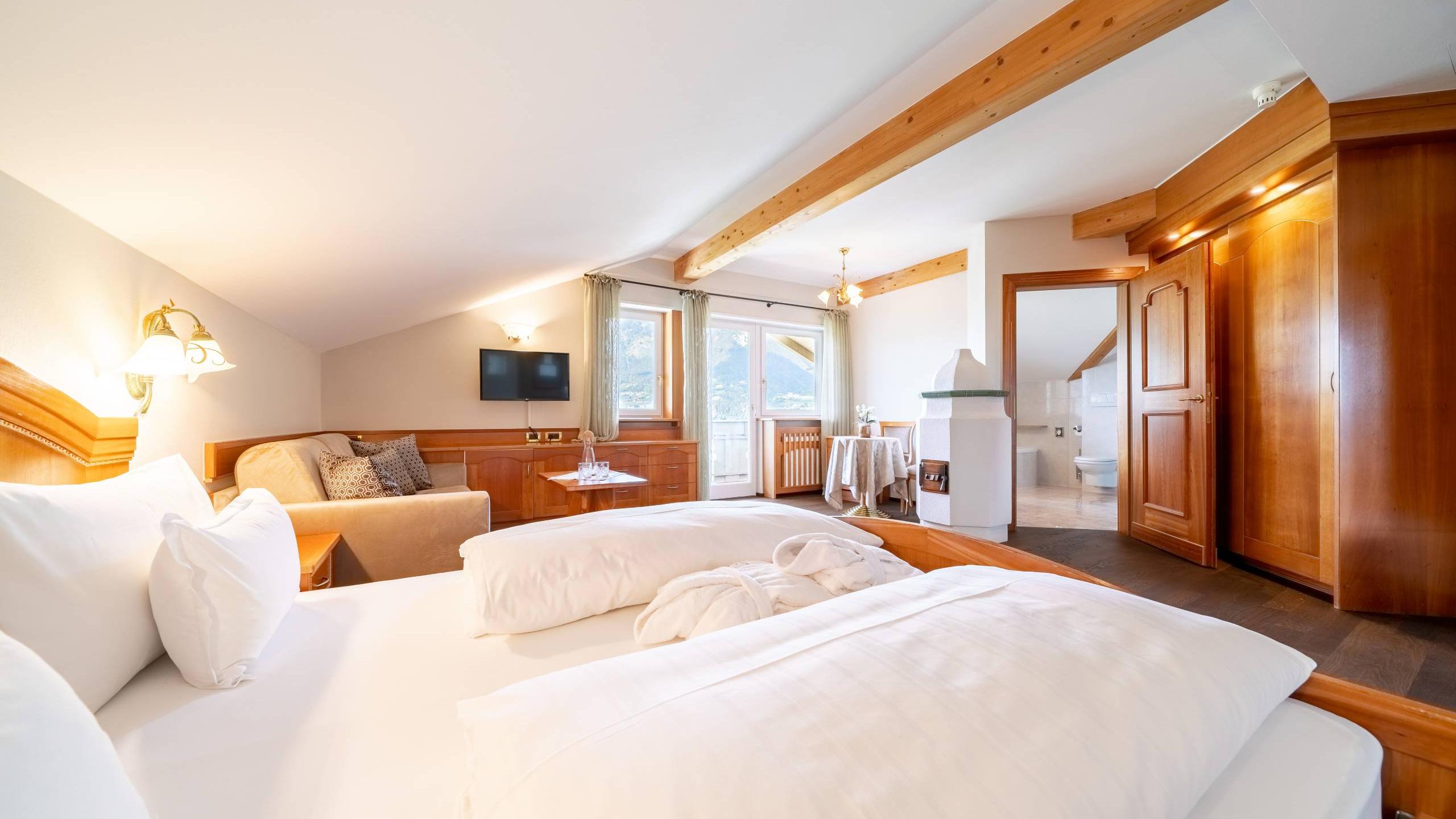 Il Doppelzimmer Hahenkamm refreshed si trova da solo al terzo piano, nel caratteristico “Giebel”, sopra la valle. Ampia, luminosa e tranquilla, offre massima privacy. Balcone a sud-ovest con vista fenomenale, pavimento in legno moderno e nuovo letto confortevole. Nel 2026 la camera splenderà in tutto il suo nuovo splendore grazie a una moderna ristrutturazione.